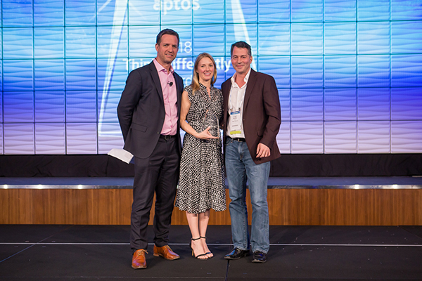 Aptos' Sarah Roberts (center) accepts the Customer Commitment Award from Paper Source CIO Fred Bailey (right).[/caption]