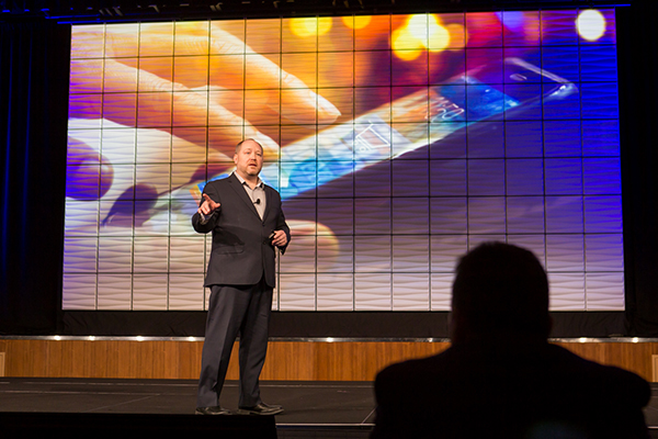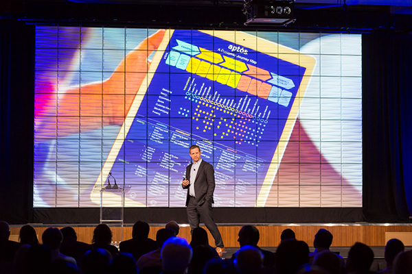 Aptos CEO and Culture Leader Noel Goggin talks customer journeys during his State of the Business opening address.[/caption]