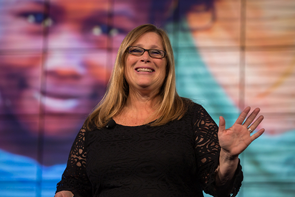 Aptos Account Manager Diane Cerulli takes the stage to give an update on the amazing progress being made by RetailROI and Lifesong for Orphans in Bercy, Haiti[/caption]