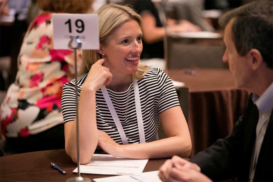 [caption id="attachment_6989" align="aligncenter" width="900"] Aptos' Sarah Roberts discusses news from Aptos Labs with a client during 1:1 networking.[/caption]