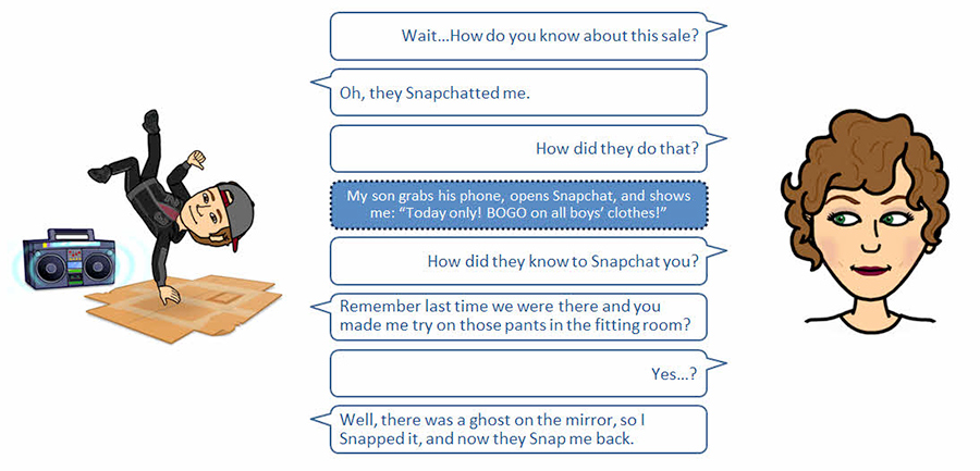 He's 11, and he's only into approved-by-me social media applications. So he's restricted. He's not on Twitter, he's not on Facebook, and he does not have a public email address. But regardless of these limitations, this retailer was able to engage with my son. They managed to inform him about a sale and motivate him to get me out of bed and into a store. Once we arrived, we were engaged, encouraged and enticed to spend more money than we intended. Wrap your mind around that.