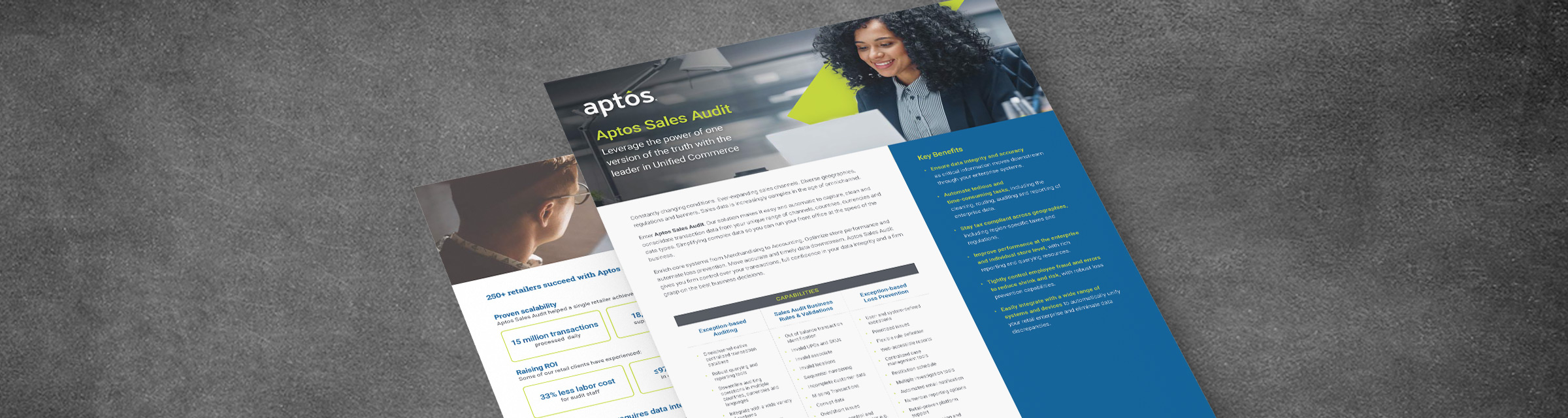 Aptos Sales Audit lets you efficiently process data from all transaction sources and channels to the enterprise systems that depend on it, and enables you to optimize three critical data-driven retail functions with a suite of powerful applications: Sales Audit, Loss Prevention and Voucher Management.